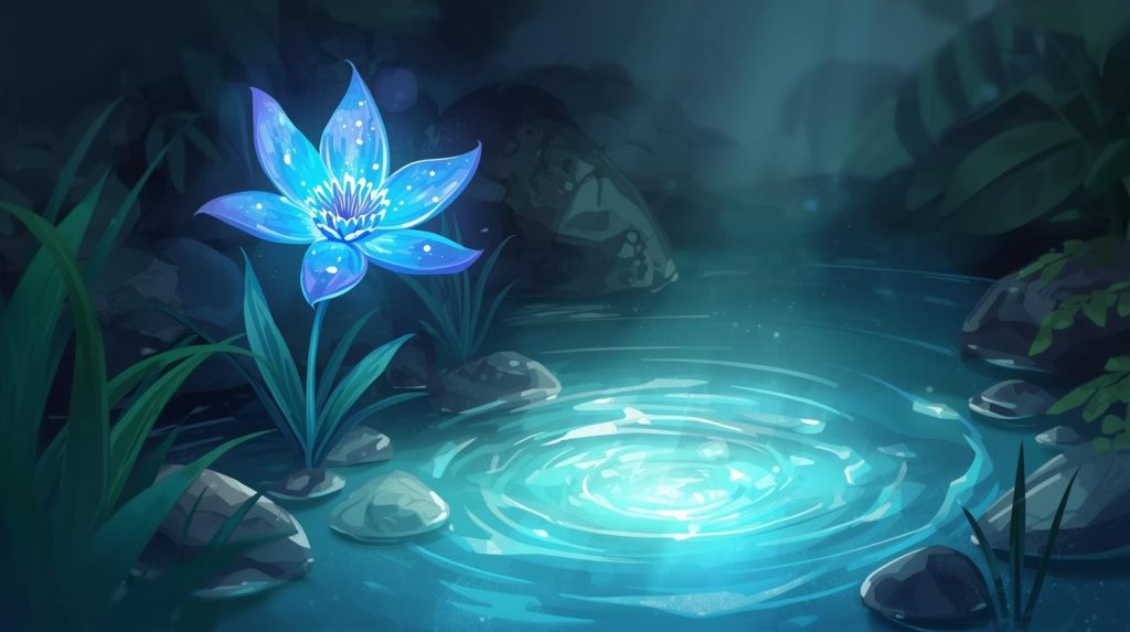 I wtedy towarzysząca mu elfka wskazała na tajemniczy, cudowny kwiat, co rósł przy źródle w głębokim, olchowym wąwozie. Na ten widok Crispin krzyknął tak głośno, że zanurzone we śnie sarny zerwały się z przestrachem, zaś echo jego głosu potoczyło się po skalistej ścianie niczym odległy grzmot. To był on – błękitny kwiat! Z kielicha unosił się słodki zapach, a spod ziemi połyskiwało złoto. Lśnił niczym szmaragd.