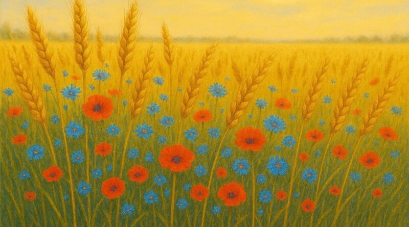 Żółte łodygi rosły gęsto obok siebie, kłosy były pełne i ciężkie, sięgające aż do stóp łodygi. Zaś spośród zboża żółtymi oczkami słodko spoglądały błękitne i czerwone kwiaty.