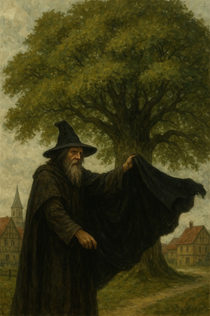 Bo pewnego dnia dziwny człowiek znów się pojawił, poszedł do ogrodu i wszedł do wnętrza spróchniałego drzewa. A gdy z niego wyszedł, to trzymał w ręku wielką, czarną tkaninę, którą rozpostarł i na której poleciał ponad wioską. A w tej tkaninie nie było nic innego, jak właśnie sama dżuma. I wtedy w wiosce zaczęło się straszliwe umieranie, zaś dzwon pogrzebowy rozbrzmiewał dzień po dniu. Wszyscy ludzie umarli, jeden po drugim, aż w końcu przy życiu pozostali tylko grabarz i parobek. Mieszkali odtąd razem i dręczyła ich ogromna obawa, który z nich będzie musiał jeszcze umrzeć. Bo tajemniczy obcy zapowiedział, że wszyscy mieszkańcy zginą – oprócz jednego.