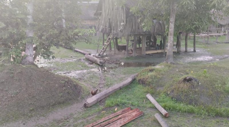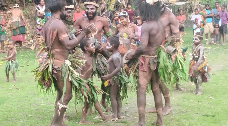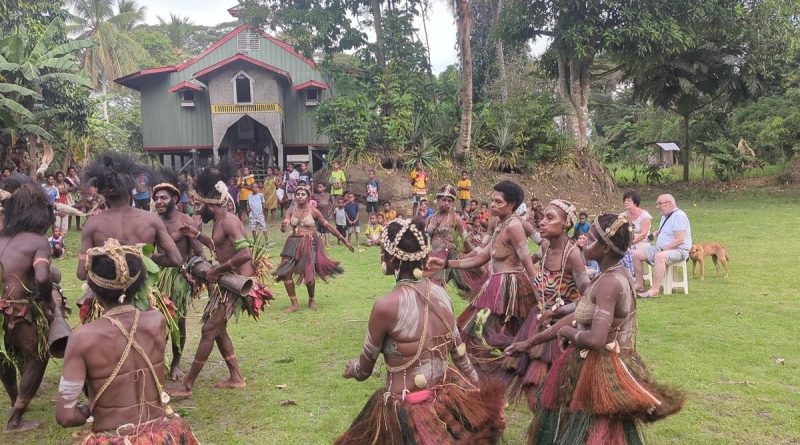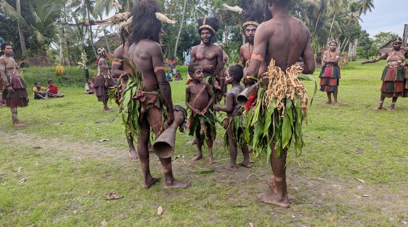 Po skōńczyniu tańcowanio poszli my zaś do jejich sam dōmu duchōw w tyj wsi. Zagrali nōm trocha na tych garamutach, a bezmała kożdy z tych bymbniorzy mo swōj styl, tak że idzie poznać kery to gro, a co „godo“. Garamuciorze ôgłoszajōm wszyjski nowiny: kery umrzōł itp, ale tyż wołajōm na wojna, jak trza. Wtedy kożdy, chłop, abo baba, chyto za maczeta a idzie sie bić. Mōm nadzieja, co teraz już niy zdarzo sie to za czynsto, chocioż ks. Michał pokazowoł nōm zgorane chałupy. Po tym tańcowaniu a garamutach mieli my trocha bōmbōnōw dlo dziecek, dyć dziecka sie kajś potraciyły i Martynka niy poradziyła ich znojś. Musioł żech ji pōmōc. Stykło pokozać bōmbōn jakimuś synkowi, a zaroz przilecioł, za nim drugi, trzeci, a potym cołko wieś. Dzielyli my piyrsze po jednym, coby nōm niy zebrali wszyjskigo, dyć za chwila Szymōn wziōn, a zaczōn ciepać do gōry cołkōm gościōm pora razy. Ôroz jo żech doł pozōr, co ôni te lizoki liżōm ze papiōrkami, tōż musioł żech im pokozać, co to trza ôdwinyć. Zrobiyło mi sie tak trocha żol tych dziecek, jak żech ich widzioł jeś łapczywie te bōmbōny (trocha ôstało na jutro), Jak żech im pōmōg poôdwijać te papiōrki ze bōmbōnōw, to my poszli do chałupy ôd farorza na wieczerzo. Gospodorze prziniōśli nōm pora rybōw Makao, upieczōnych we liściu bananowca a placek saksaku. To je tako przeźroczysto gōminkyjza bez szmaku, ale idzie tym bezmała zatkać głōd. Dlo tych ludzi ryż to je yno na świynta. Szymōn prziwiōz im flaszka ôleju do smażynio, a ôstawiōł im reszta tyju a kawy, co my niy zużyli. Takij biydy żech jeszcze niy widzioł. Farorz przijyżdżo tam roz za czas, szkoła jakoś niby je, yno rechtorōw niy ma, bo do sklepu, abo do dochtora trza płynyć te 100, abo wiela tam kilometrōw. A tako rajza kosztuje bezmała 50 Kina. Ludzie miyszkajōm we chałupkach na palach. Zdarzo sie, że przi powodzi pora miesiyncy stojōm ône we wodzie, tōż niy ma co jeś, niy idzie wylyź, yno płynyć. Dyć niy ma barzo kaj płynyć. Wody niy ma, sztrōmu niy ma, pōmocy z rzōndu niy ma. Dyć i bez powodzi, jak rano stanōm, to siedzōm w ciyniu bez celu, nic niy robiōm. Niy ma tam żodnej roboty, możno yno te bilumy heklujōm. Bezmała baby ze starszymi synkami wypływajōm we porze deszczowyj na miesiōnc na jezioro kajś, chytać ryby, potym to muszōm sprzedać na torgu w mieście (ponad 100 kilometrōw na łōdce), a za to kupić trocha ryżu, abo czego inkszego na cołki rok. My, ze Martynkōm a Szymōnym, nocowali my u Tōmasa, kościelnego, w jego chałupie blisko kościoła. Chałupa z dworu wyglōndała na bogatszo ôd inkszych, była z desek, a niy ze liścio palmy.