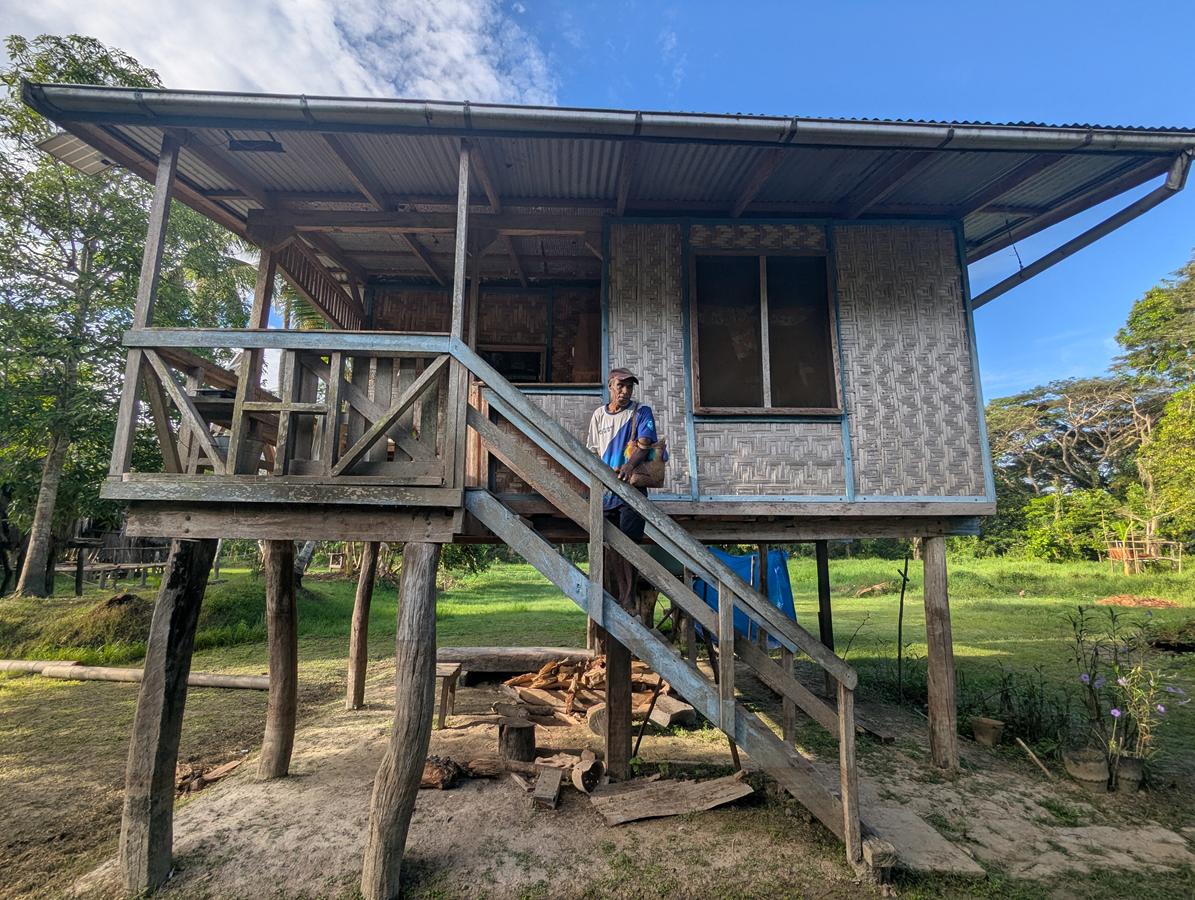 Wlazuje sie do gōry po schodach, abo drabinie, powiōnzanyj z jakichś patykōw bambusa. Pod chałupōm sie w dziyń siedzi we ciyniu. W pojstrzodku chałupy (kole 5 na 10) a możno wiynkszyj), niy ma żodnyj ściany, a yno jedna izba ze delōwkōm. Nōm położyli przi dźwiyrzach nasze madrace, co my prziwiōźli ze sobōm, a nad nimi powiesiyli prziwiōnzane na szpagatach do balkōw moskitiery. Co było dalij we izbie, niy wiym, byli my tam już po cimoku. Jak my prziszli, to na pojstrzodku siedziało dużo dziecek, ale niy wiym, czy to byli wszyjscy stōnd, abo prziszło pōł wsie sie na nas podziwać. Jak my wleźli pod te moskitiery, a polygali, to ci ludzie sie kajś potraciyli. Mi sie zdo z drugij strōny izby polygali na jakichś matach a spali. Martynka pado, co mieli tam tyż jakiś swoji prowizoryczne moskitiery. Pod chałupōm, niy wiym czy pod kożdōm, skłodali jakoś fojera, abo coś polyli, co sie z tego kurziło a ôdganiało kopruchy. Tak my przespali do rana, abo przeleżeli, bo cołko noc pioły kokoty, kury ryczały, jakiś inksze zwierzynta piszczały. Było fajnie, yno trocha duszno bez propyrloka. Tak sie skōńczyły moji niyzapōmniane urodziny. Rano, po śniodaniu ze biksy ze chlebym, ruszyli my nazod nad rzyka, coby płynyć do Kunjingini. Jōzefa niōśli zaś we lektyce, a nasze pakōnki niōsły dziecka, bo chciały dostać po bōmbōnie. Po fest gorkim pożegnaniu, fotkach, uściskach rōnk, ze kożdym praje miejscowym człowiekym, ruszyli my rzykōm tym razym pod gōrka. Na kōńcu czakoł na nas ks. Michał, kery wziōn nas do sia na lunch a kawa, a potym zawiōz nas do Kunjingini. Nad rzykōm pożegnali my sie ze Filemōnym z motorōwkōm, a jo dostoł żech ôd niego piykno rzeźbiōno maska z drzewa ze głowōm ôd krokodyla – pukpuka.