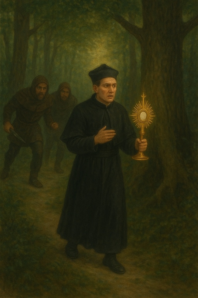 Kapłan szedł szybko wąską ścieżką, która wiła się pośród jeżyn i gęstych krzewów. Jego dusza była przy Bogu. Modlił się do Niego, błagał za konającym, który czekał na kapłana. Nagle usłyszał za sobą hałas – a gdy się odwrócił, ujrzał dwóch zbójców, którzy zbliżali się ku niemu, dobywając sztylety.