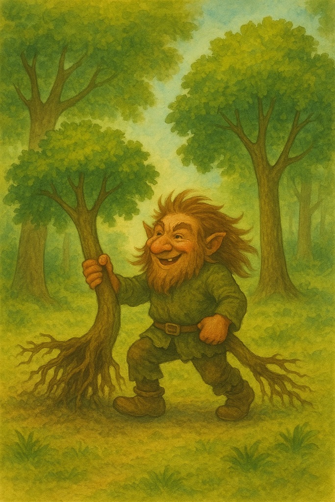 Tymczasem kobold zabrał się do pracy. Nie potrzebował ani piły, ani siekiery – jedną ręką chwytał jedno potężne drzewo, drugą zaś kolejne, i bez najmniejszego wysiłku wyrywał je z korzeniami, jakby wyciągał z ziemi zwykłe źdźbła trawy. Potem wyrwał kolejne dwa drzewa, i jeszcze dwa, i jeszcze dwa – aż wszystkie leżały równo obok siebie na ziemi. Całą pracę, którą zwykle wykonywano przez rok, Skrzatek ukończył w niespełna godzinę.