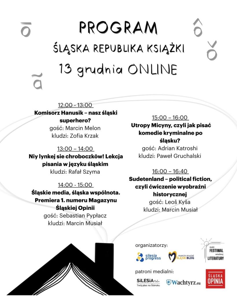 W trakcie wydarzenia uczestnicy będą mogli wziąć udział w interaktywnych rozmowach z najciekawszymi współczesnymi twórcami literatury śląskiej. W programie znalazły się dyskusje o bohaterach kryminałów, lekcja pisania w języku śląskim, rozmowa o mediach i roli śląskiej wspólnoty oraz spotkanie poświęcone powiepolitical fiction. Każde z nich będzie prowadzone na żywo, z możliwością zadawania pytań i włączania się do rozmowy w trakcie transmisji.
